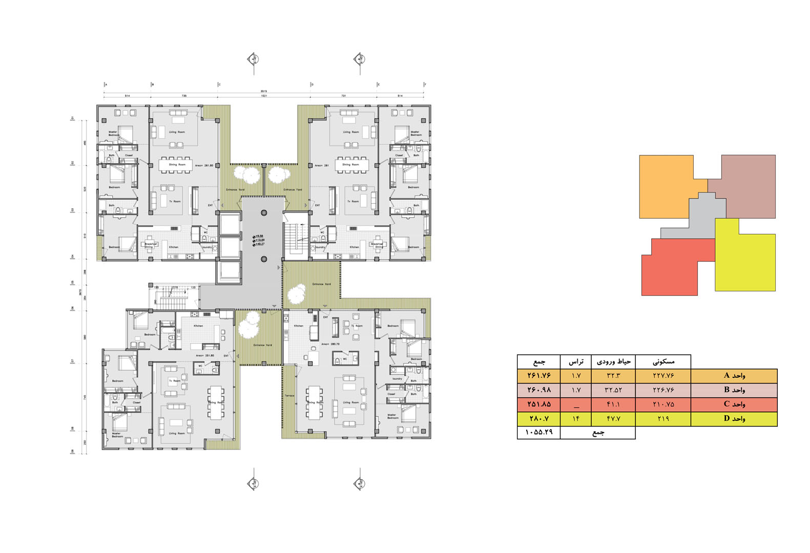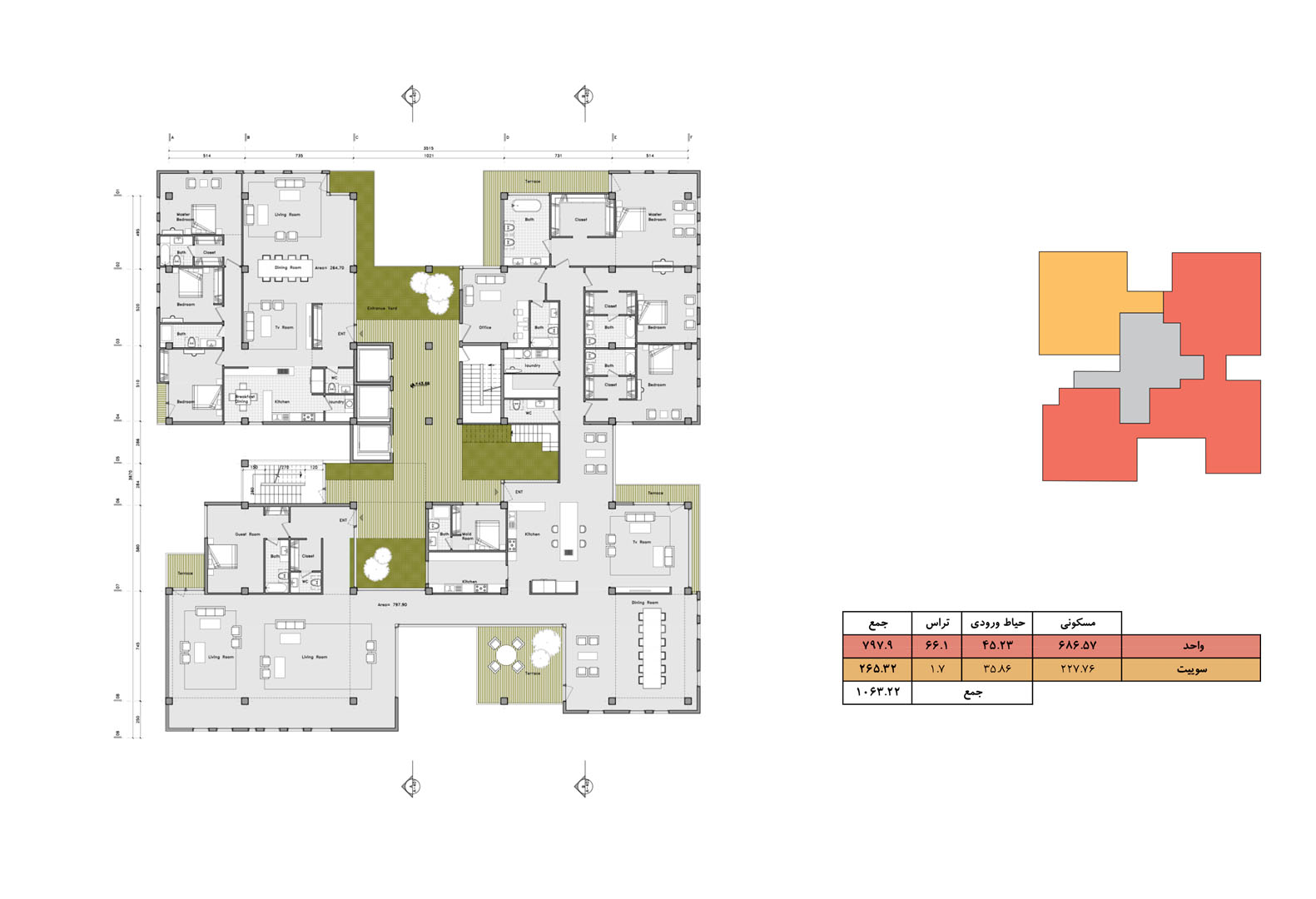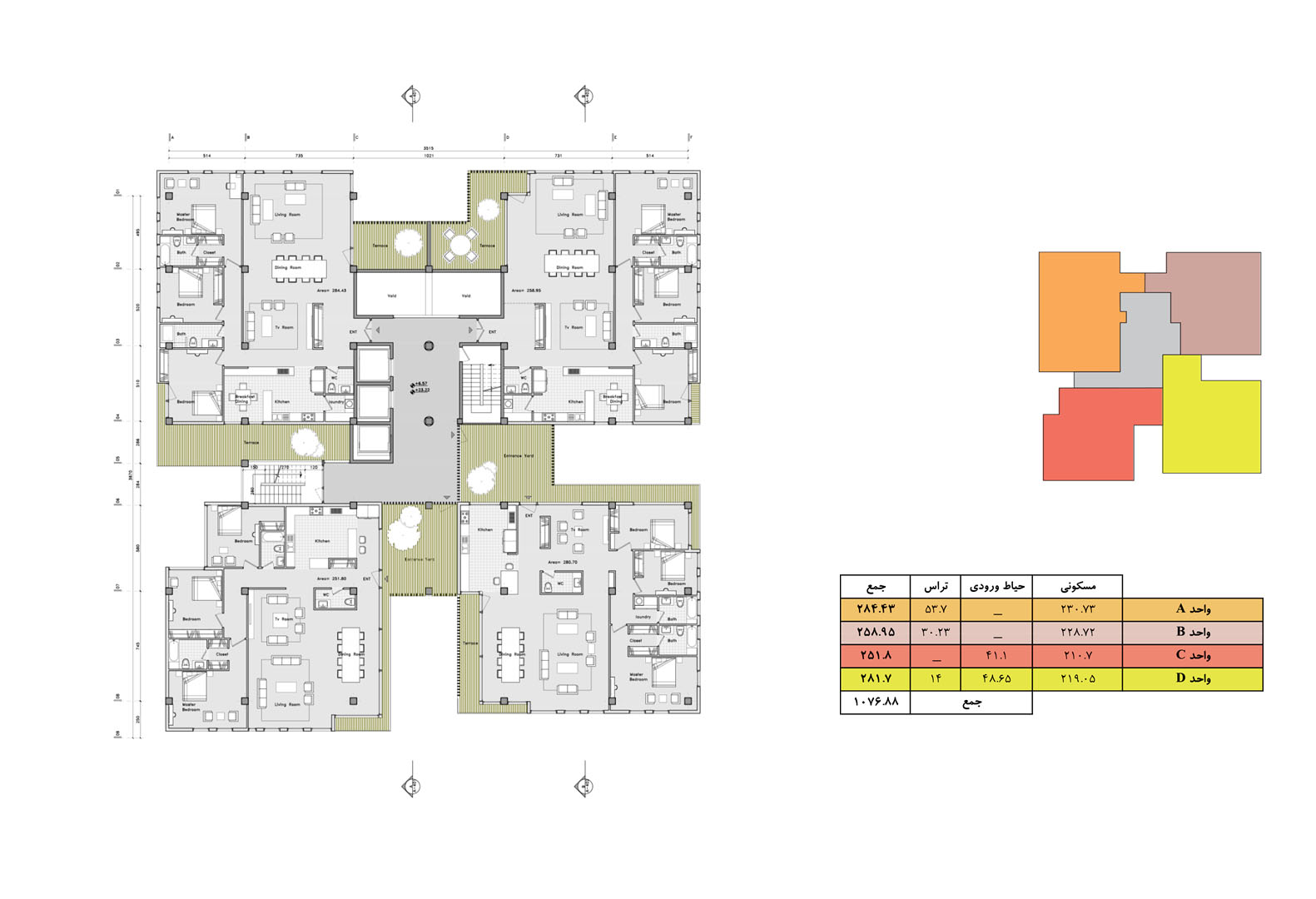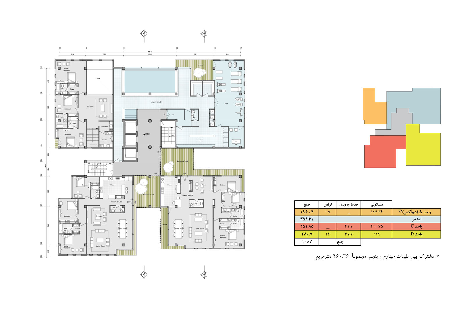 In contrast to the normalized variations of residential towers in the city of Tehran, where the volume is the result of mere stacking of units with balconies that have similar floor plans, the project is the result of aggregation of multiplicity of unit typologies that all are variations of a “House-in-the-Air” architectural genome.