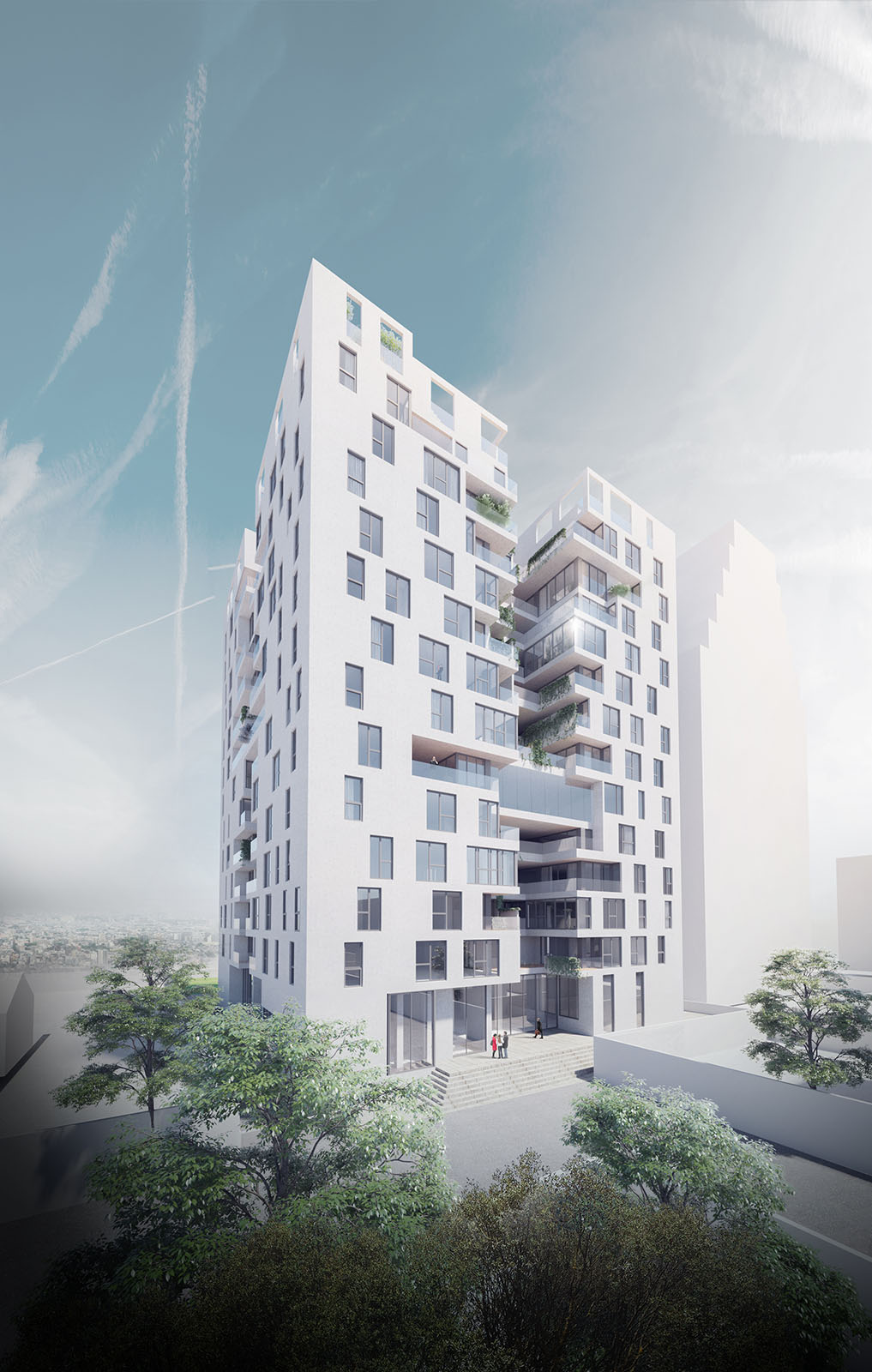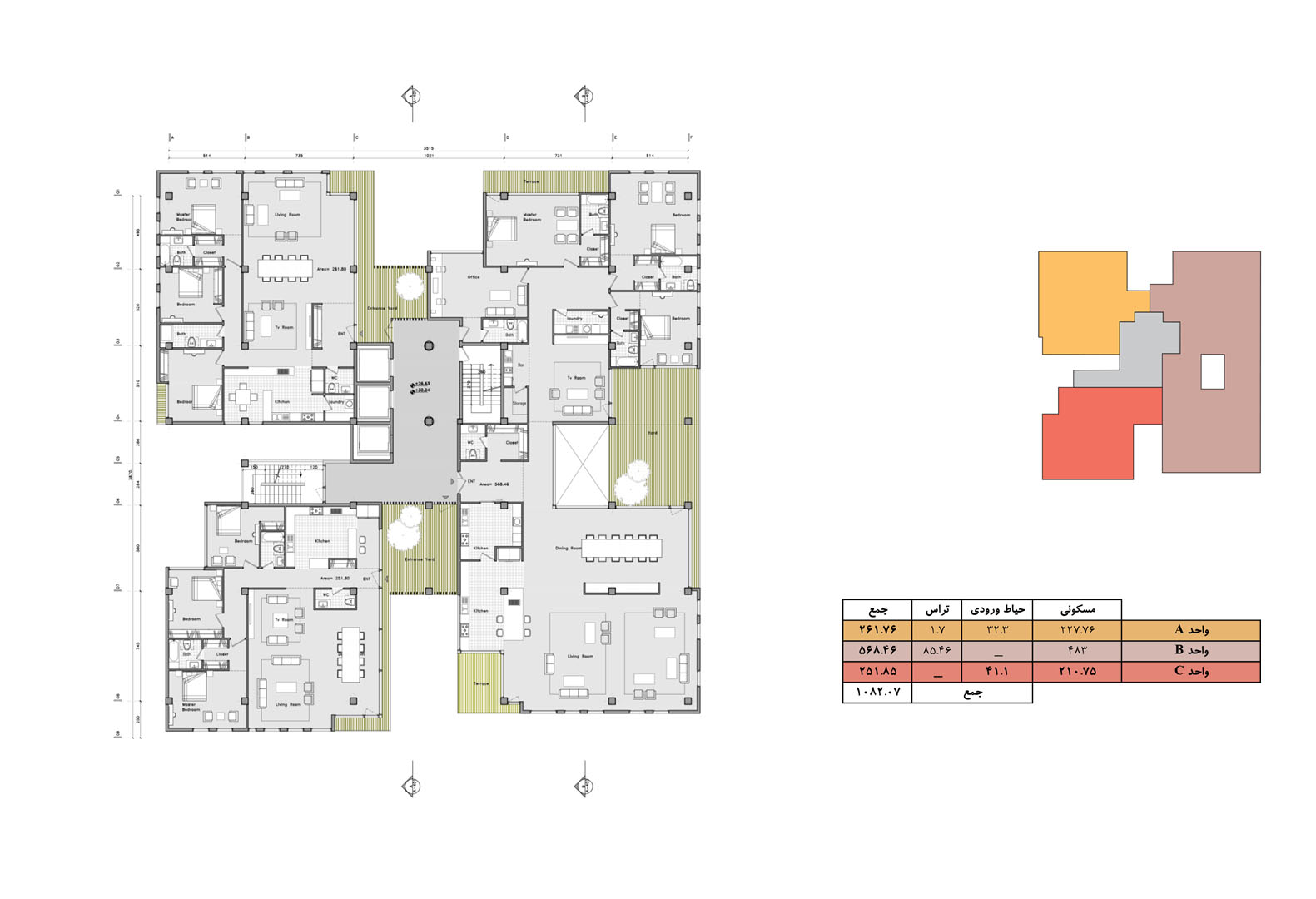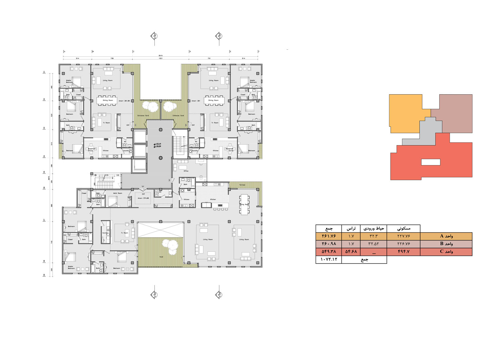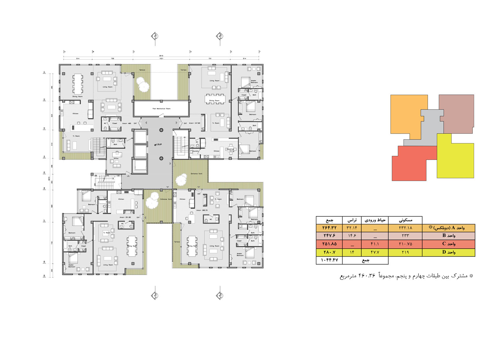 In contrast to the normalized variations of residential towers in the city of Tehran, where the volume is the result of mere stacking of units with balconies that have similar floor plans, the project is the result of aggregation of multiplicity of unit typologies that all are variations of a “House-in-the-Air” architectural genome.