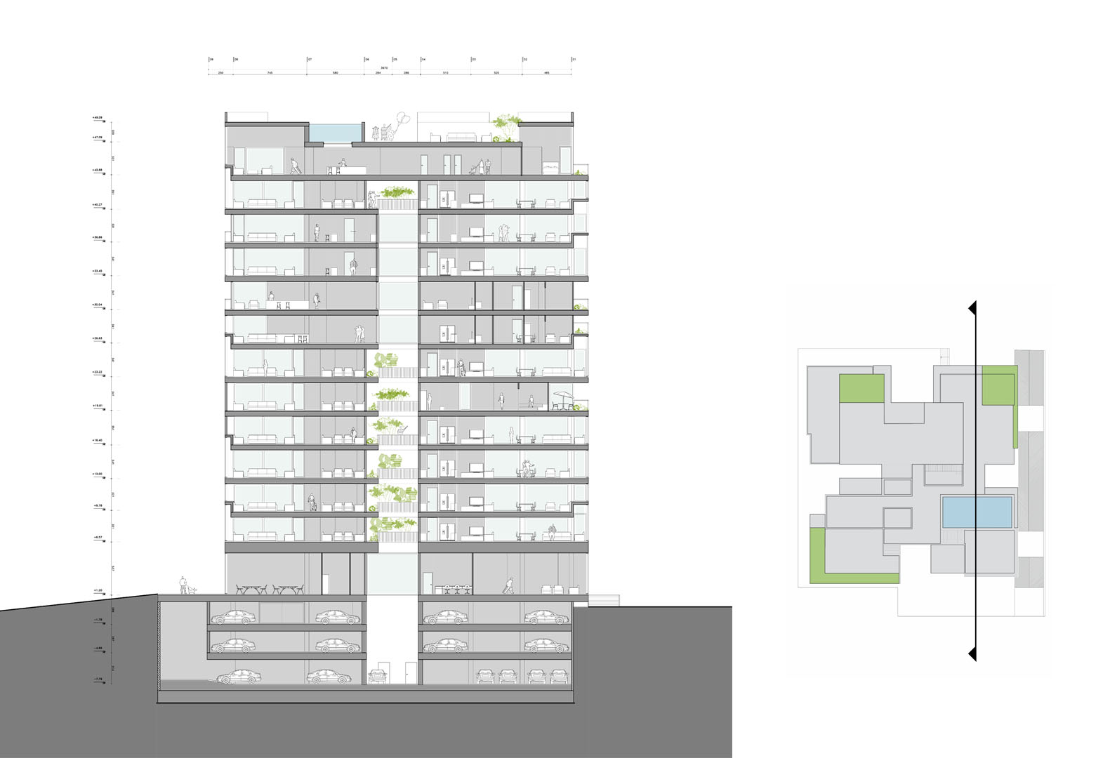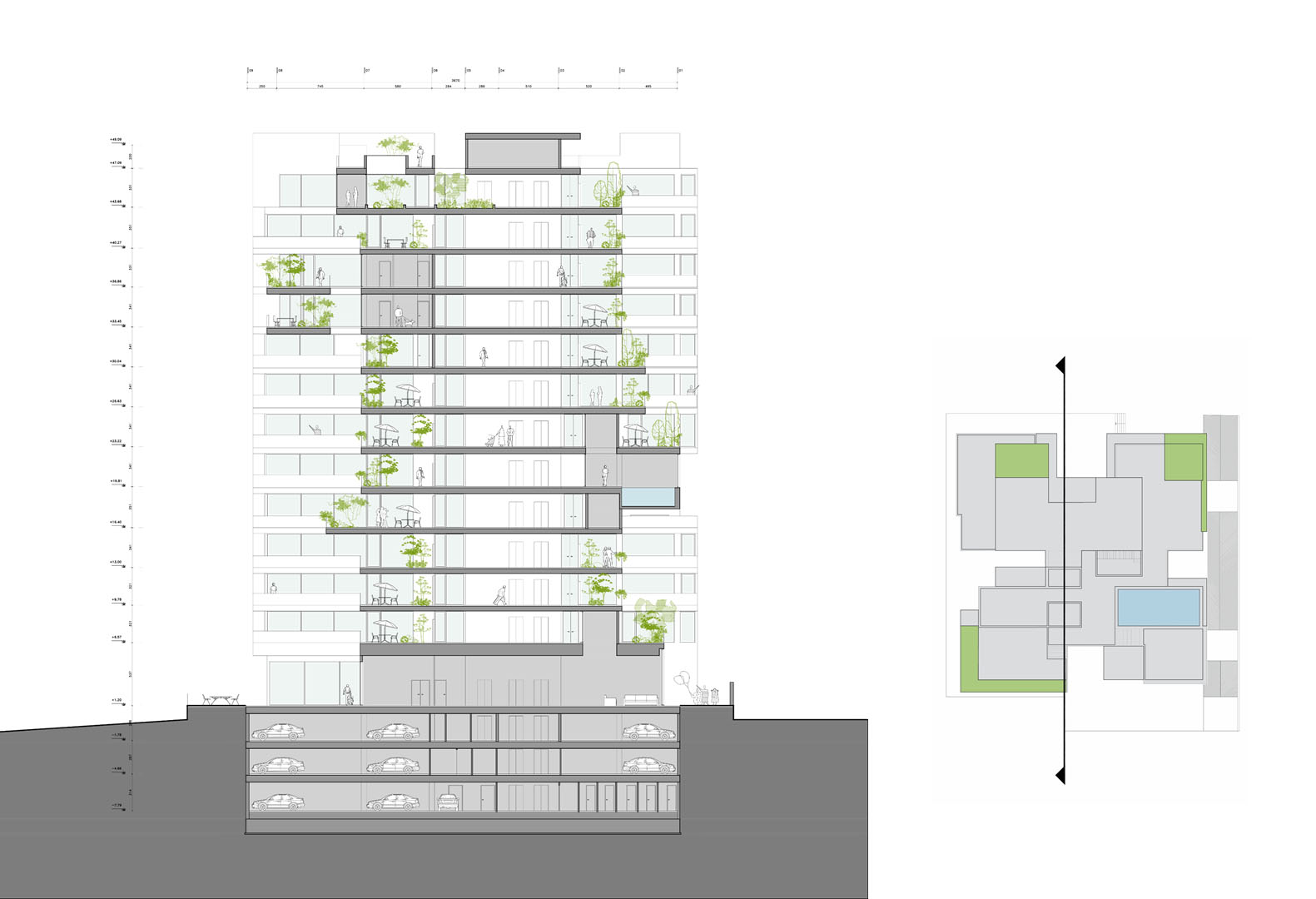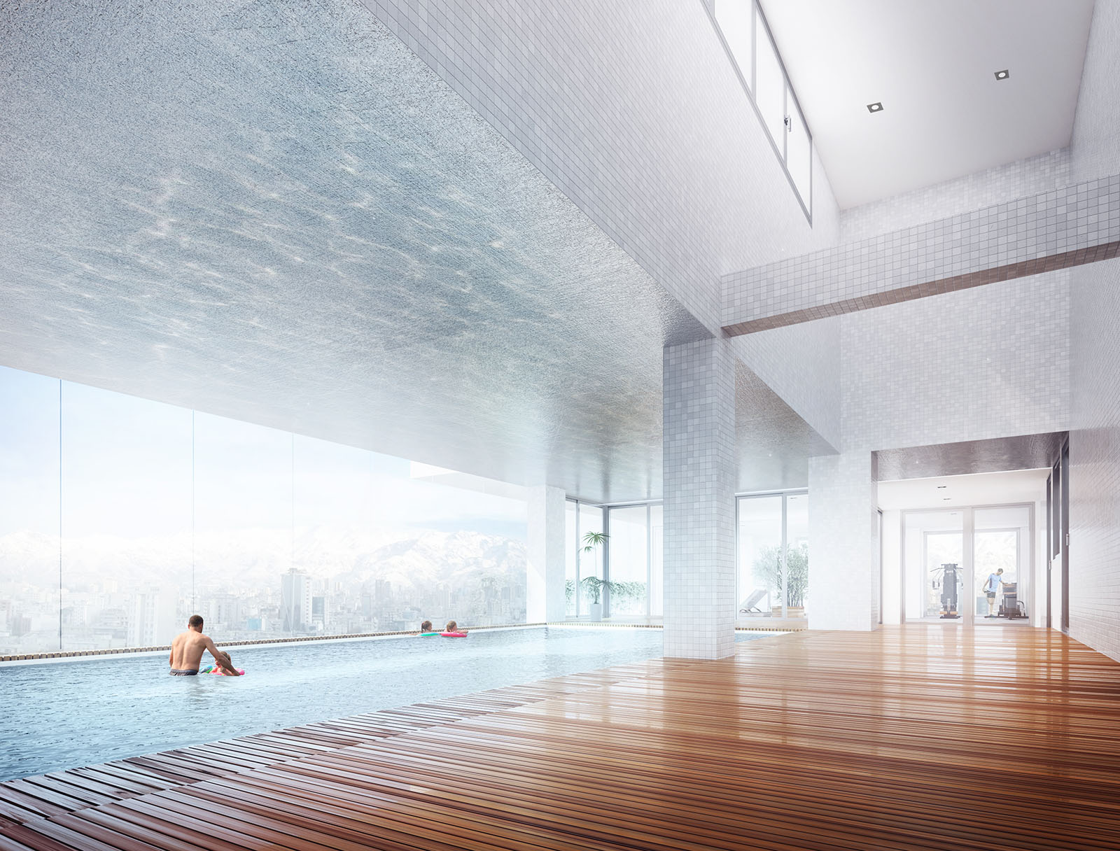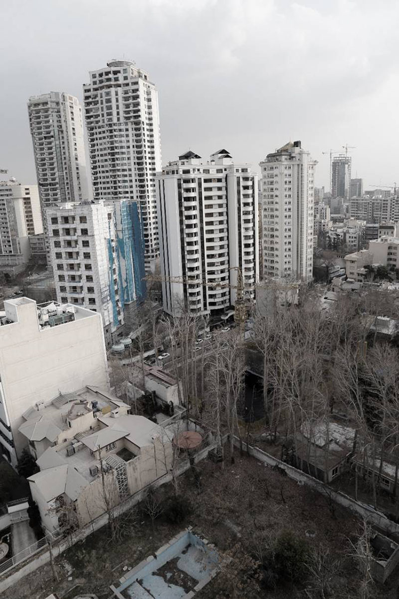 The shared spaces are redistributed in the new proposal so that the pool is relocated in one of the upper floors and benefit from the panoramic views of the city of Tehran