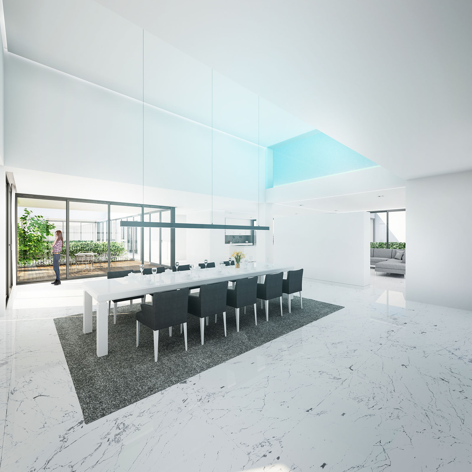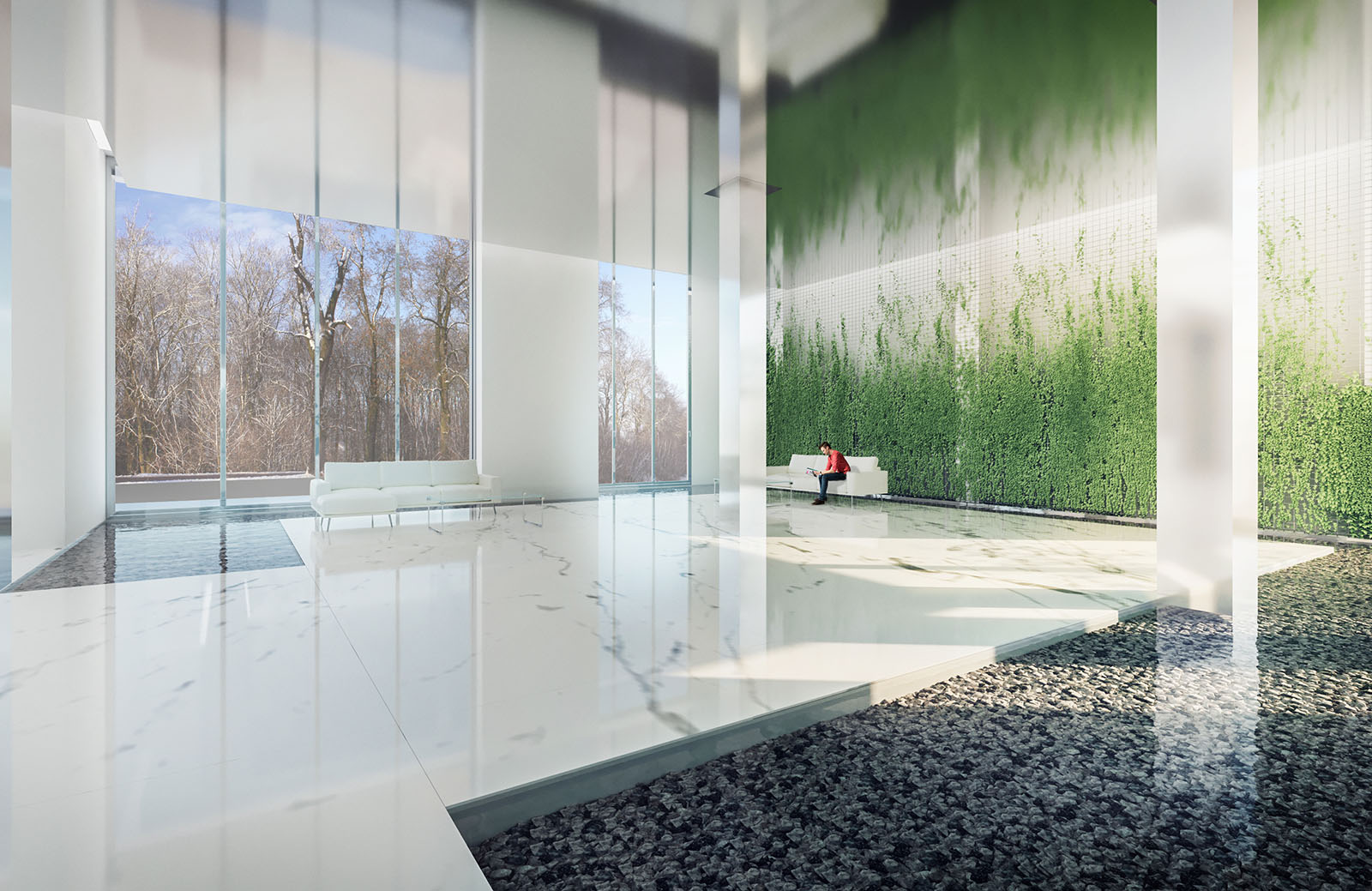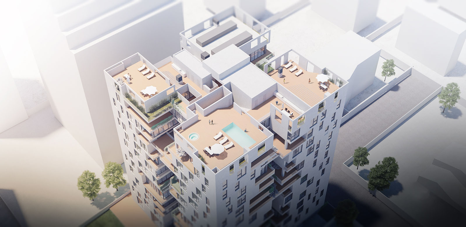 The shared spaces are redistributed in the new proposal so that the pool is relocated in one of the upper floors and benefit from the panoramic views of the city of Tehran