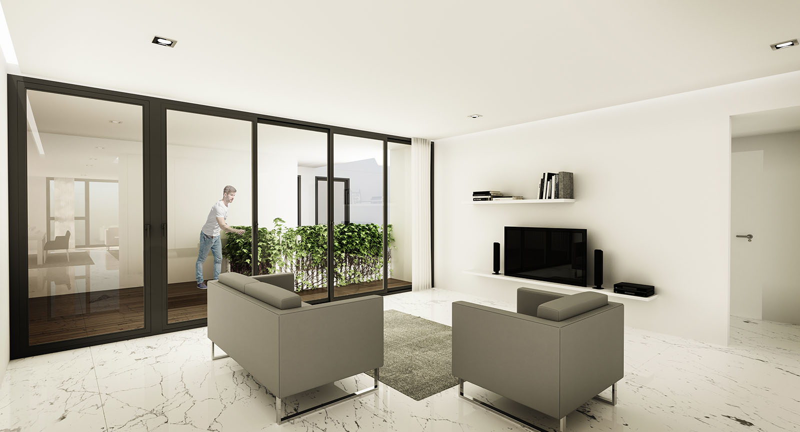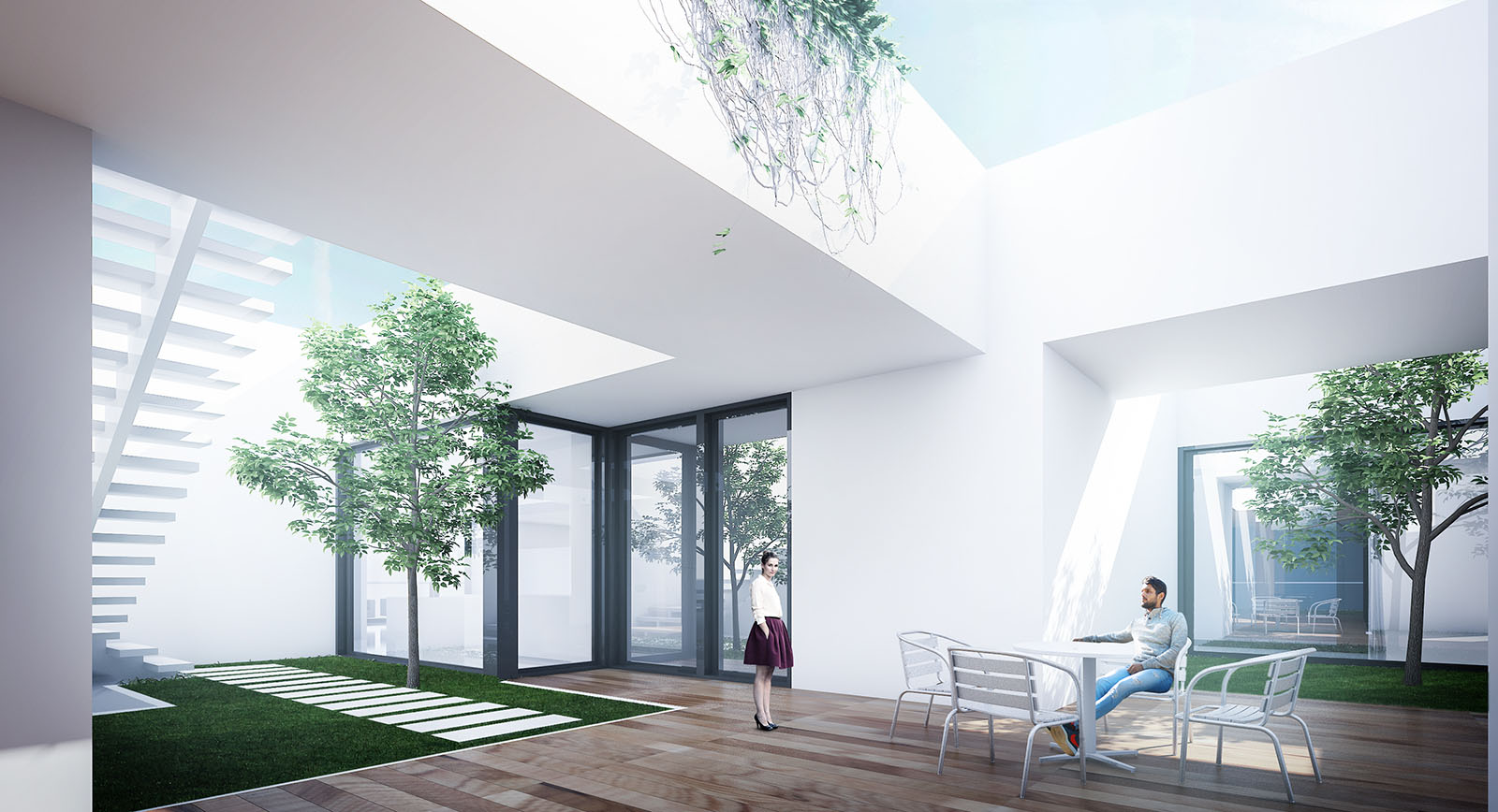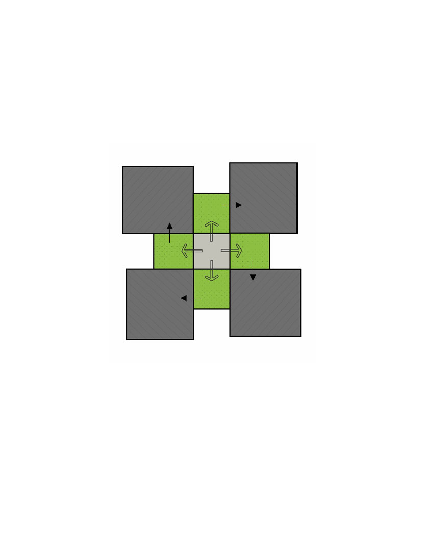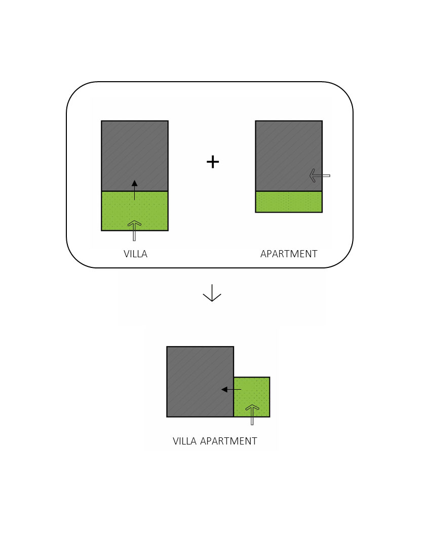 The aforementioned “genome,” is the result of a conceptual marriage between the apartment unit type and the house-with-front-yard type, both valid architectural typologies in city of Tehran. The resulting hybrid type of House-in-the-Air, allows for individual access to the interior domestic spaces from an elevated private garden.