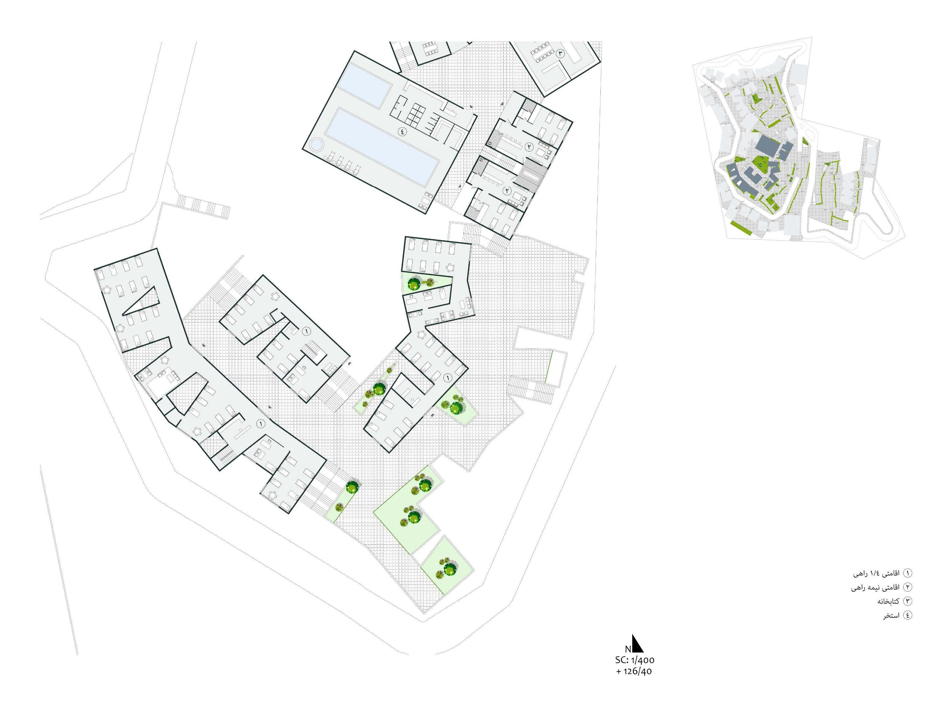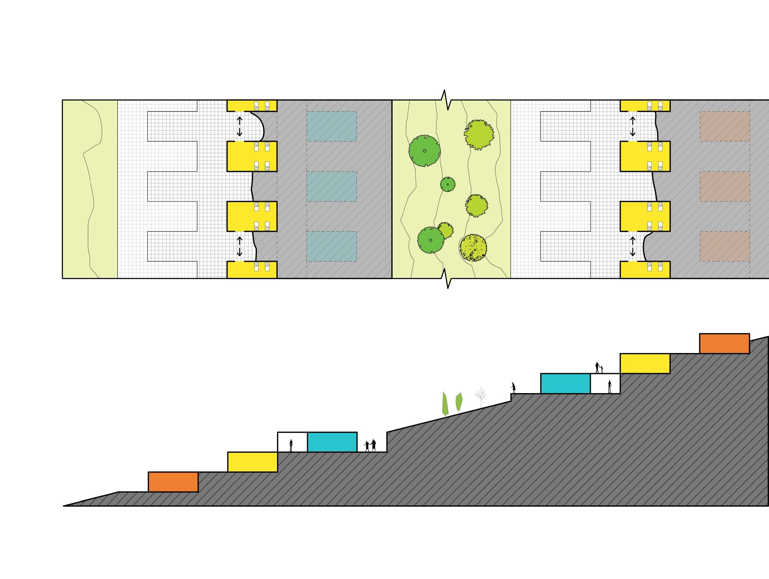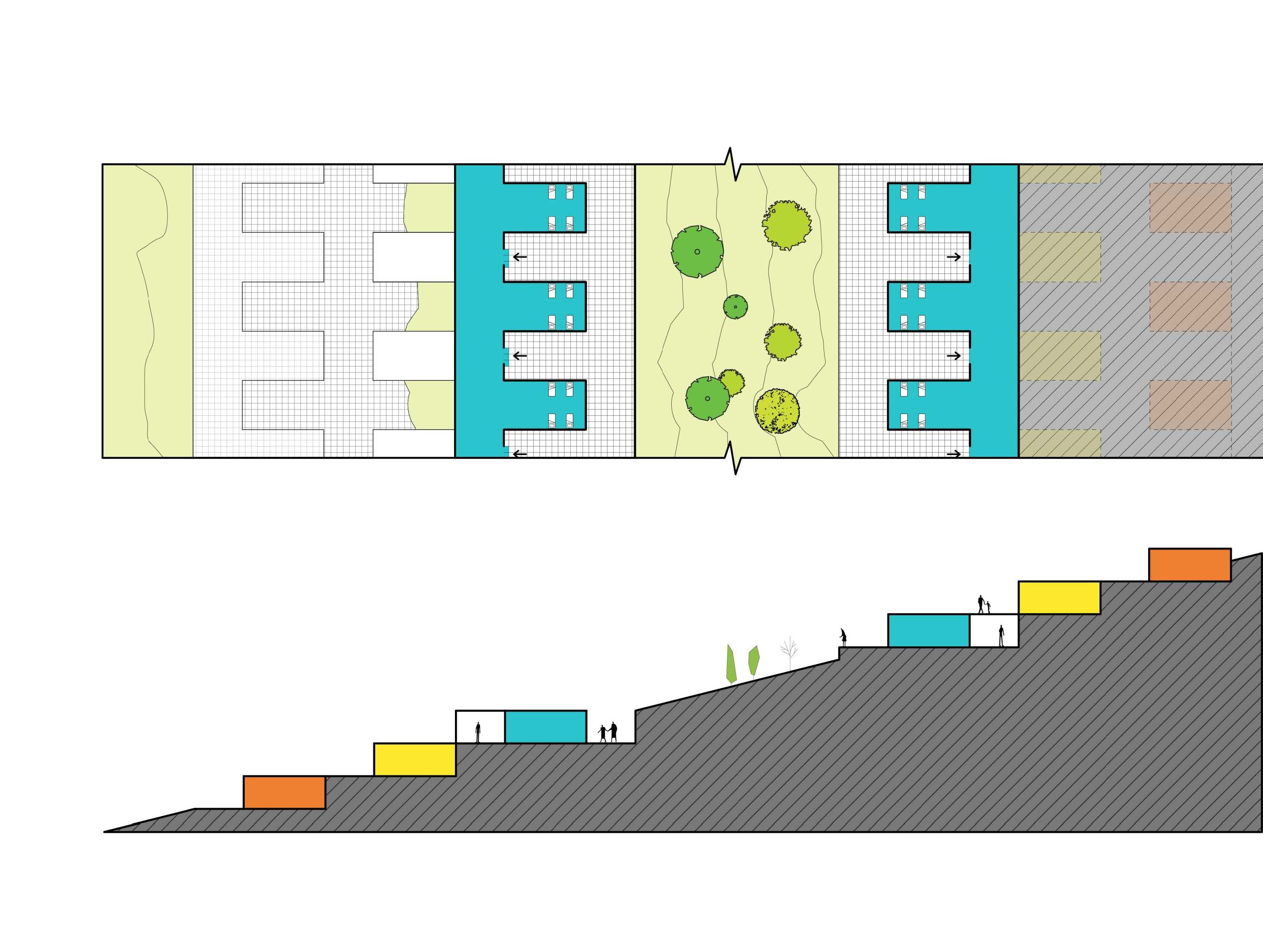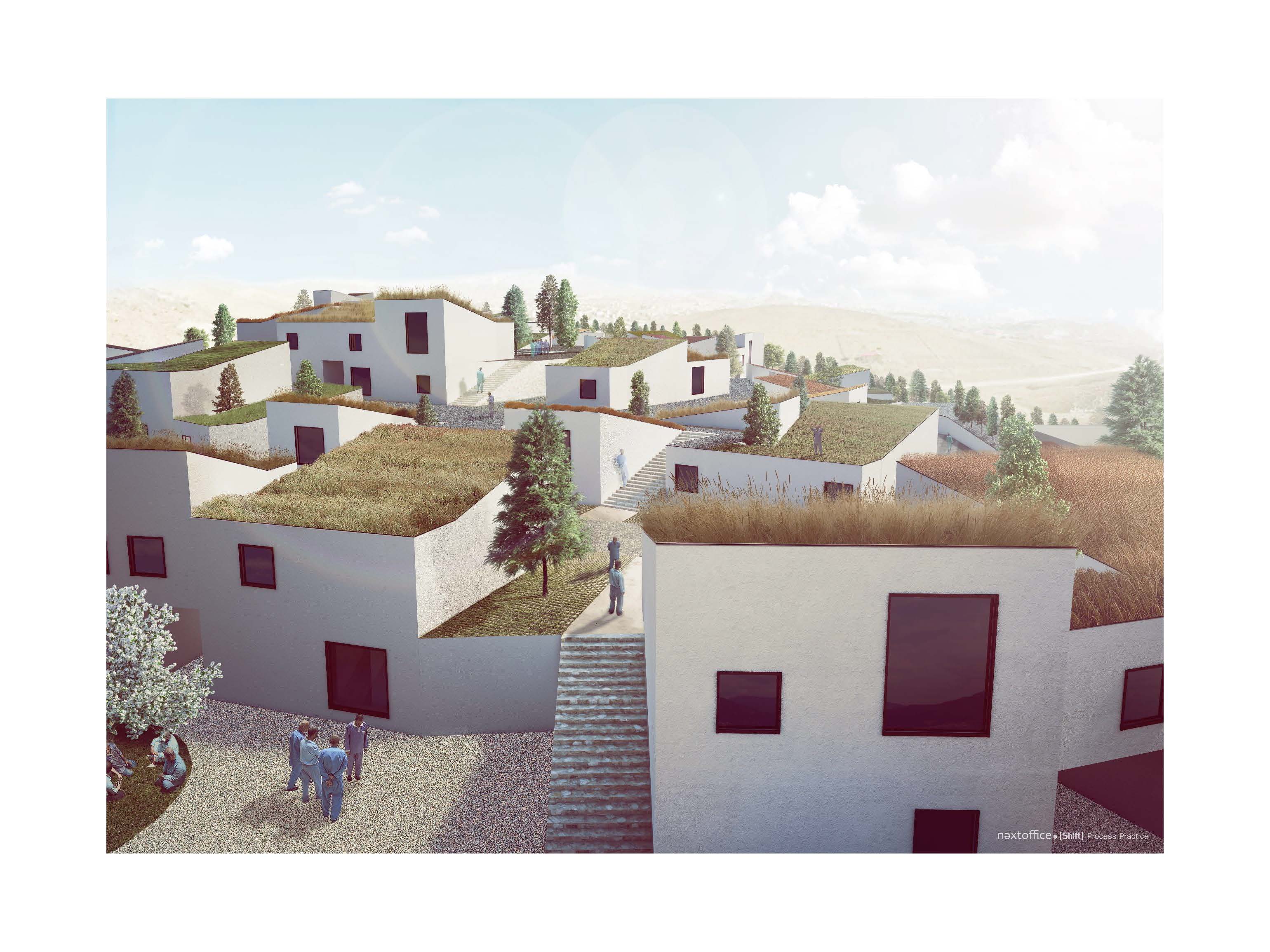 The project is located on a severe slope and as such, the formal configuration of the complex is very much informed by a series of platforms that negotiate the ground condition. On these connected platforms, typological variations of the architectural genome are strategically placed. The variegated roof creates a field condition that operates as a secondary landscape for the project.